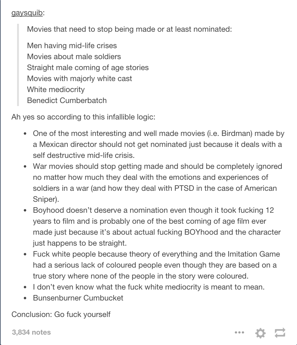 Tags: tumblr | dumblr | movies | oscars | nominations | God | These | People | are | fucking | Stupid