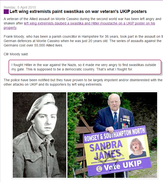 to be fair, UKIP is pretty much like the original National Socialist party (Nazi). It seems innoccuous at first, but take a deeper look and "indpendence for Brits/Germans" is just a thin veil for " **** everyone who wasn't born here or who doesn't agree with our ideals". UKIP is **** and of course it's not nice to draw Swastikas on their signs, but ultra-right-wingers are just as bad, if not worse than extreme leftists.