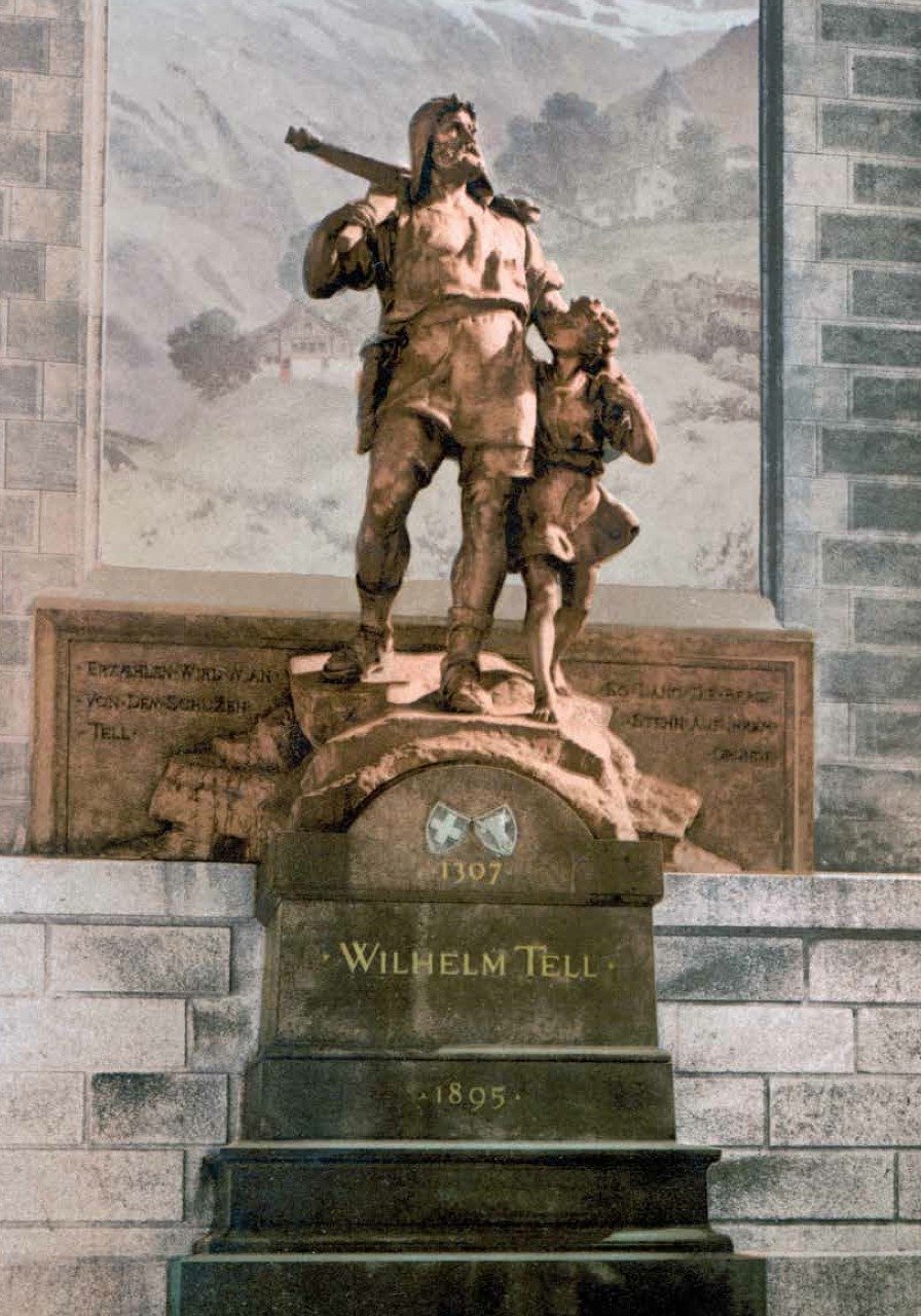 last but not least, one of our national heroes, Wilhelm Tell. Maybe you have heard of him under the name of William Tell, but Wilhelm is how we spell it, as you can see on this monument. He is pretty much the Robin Hood of Switzerland, except he is completely fictional