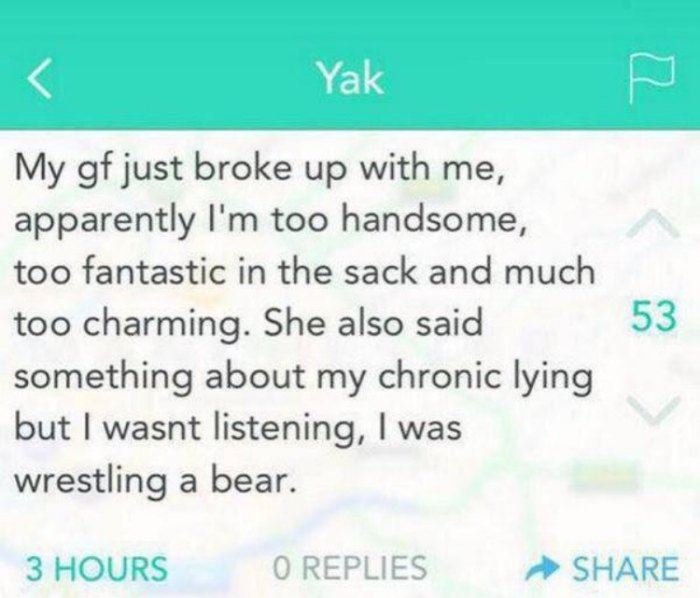 GF: You are kind, gentle, funny, handsome, hot and you write and do a lot of interesting things...but I just need some time alone.