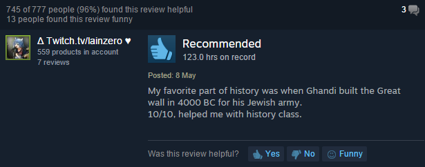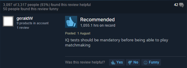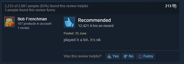 If you want to actually learn anything useful about the game you're interested in the Steam reviews are the last place to look.