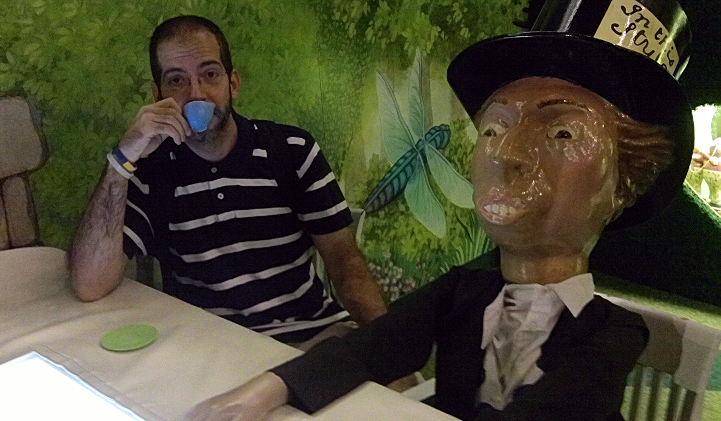 These are the times I wish I had a folder with some images, so that I might parry and thrust with you. Sadly, I do not, so I am posting this image of me having tea with this ******************** Mad Hatter. His face makes me laugh every time. its goddamn scary
