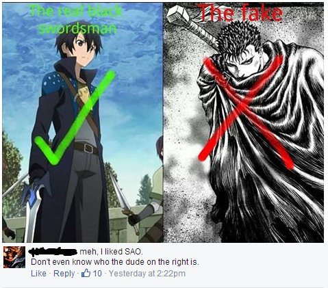 That's half the problem, calling some kid in a VRMMO that came out 2000 the original black swordsmen. Berserk is from the 80's and is an actual bad ass.