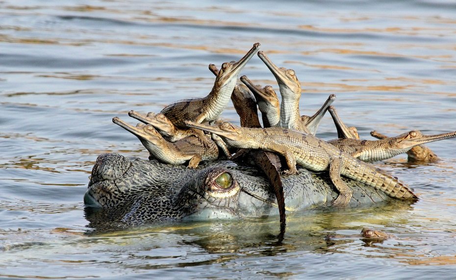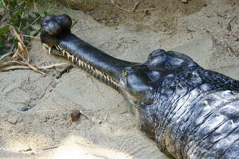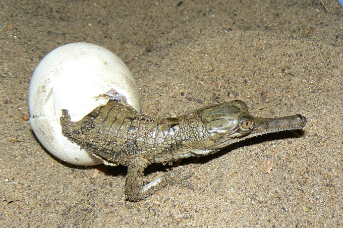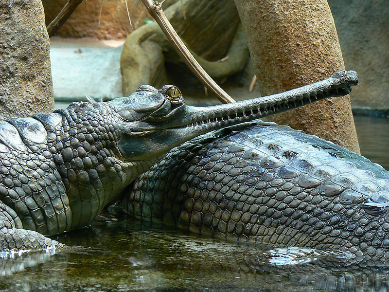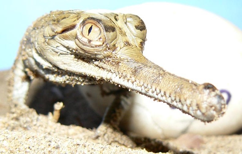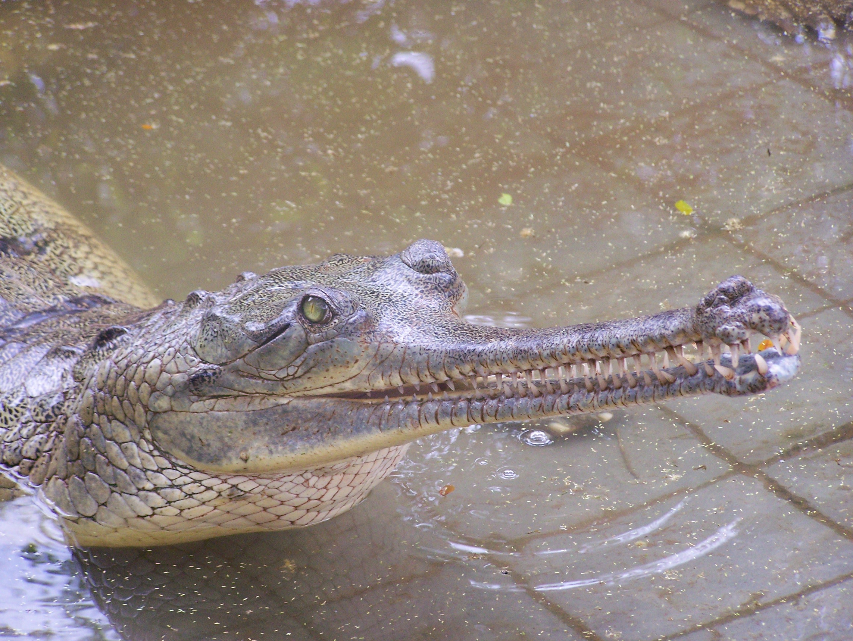 The gharial is poorly equipped for locomotion on land. Its leg musculature is not suited to raise the body off the ground or to produce the "high-walk" gait. It is able only to push its body forward across the ground or "belly-slide." It is, however, very agile in the water. The tail is well-developed and laterally flattened, and the rear feet possess extensive webbing.
