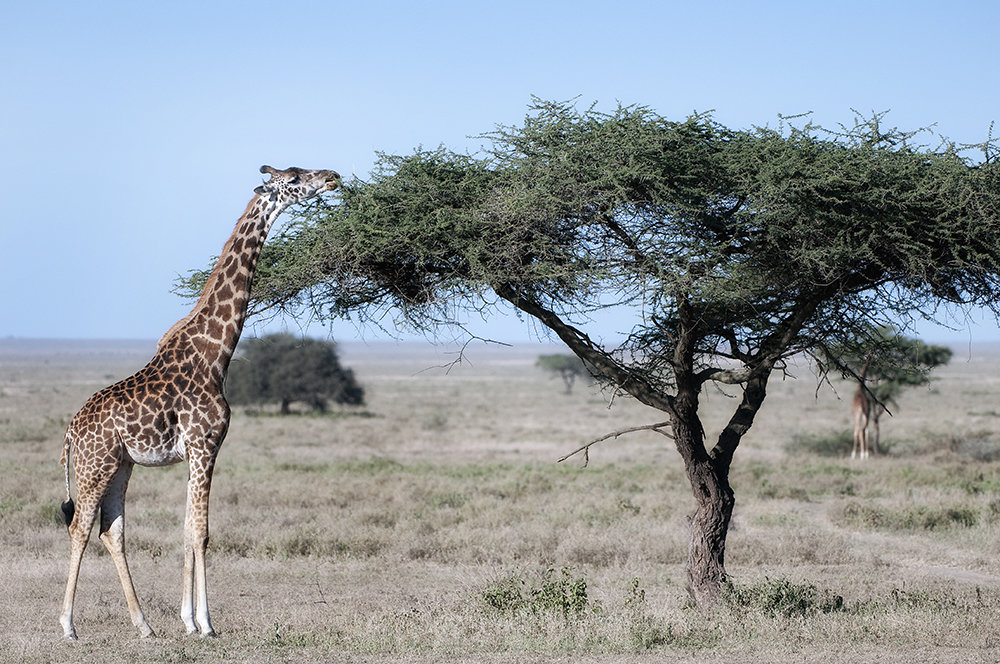 Giraffes use their height to good advantage and browse on leaves and buds in treetops that few other animals can reach (acacias are a favorite). Even the giraffe's tongue is long! The 21-inch (53-centimeter) tongue helps them pluck tasty morsels from branches. Giraffes eat most of the time and, like cows, regurgitate food and chew it as cud. A giraffe eats hundreds of pounds of leaves each week and must travel miles to find enough food.