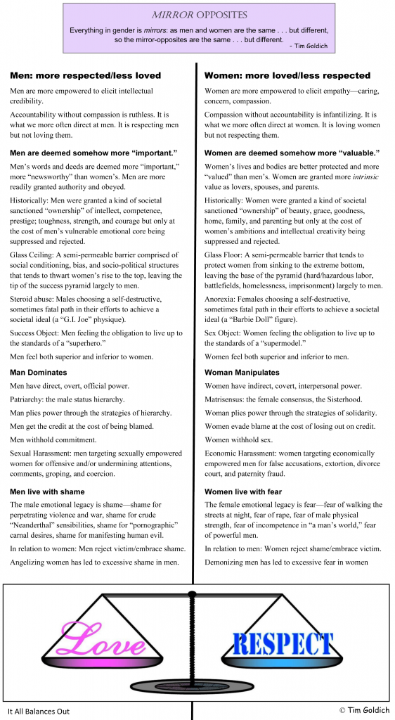 I completely agree with your points, but I don't think that equality is a stupid thing to strive for. It's a great thing to strive for, granted that we're talking about value and equal opportunity rather than equity of the genders themselves. Such a thing, as you pointed out, would not be a good idea: hell it's impossible males and females are different. period. . But equality of respect between the genders sounds fantastic! If two humans are to have any different "value" I struggle to say different human values unless I provide that I believe all humans are very highly valuable , it should be based upon something entirely irrelevant to gender.