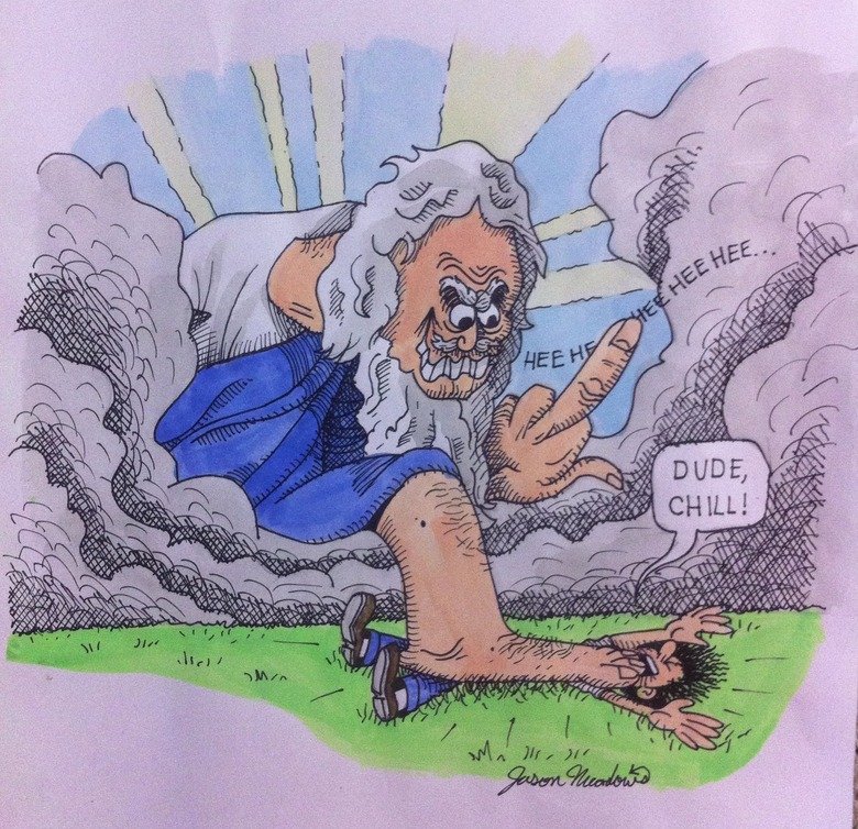 Idk? Haha. It's just how I felt when I drew this. Have you never had bad things happen to you for no reason? Makes it seem like if there was a God he's a cynical asshole. I was just recently made homeless and jobless for nonsensical reasons when I drew this.