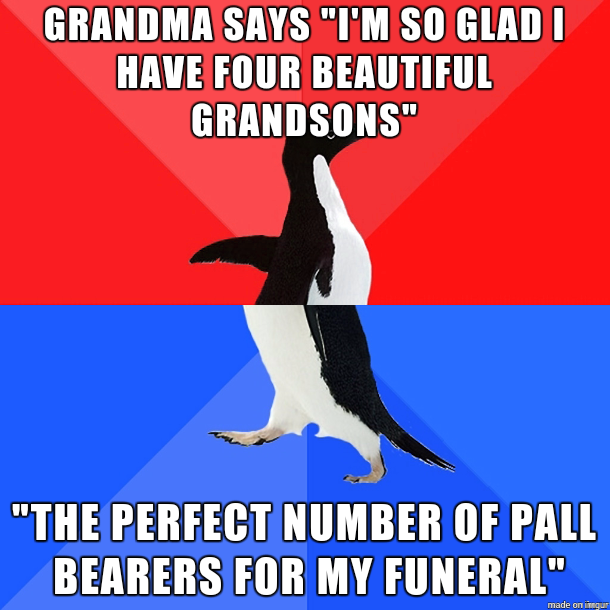 Grandma likes to think about the future Flag themurrey (See more...) next random - Fav Favorite Comment ✖ Top NextComment next Tags: socially awesome | socially awkward | meme | funeral +58 Views: 5009 Favorited: 1 Submitted: 11/26/2015 Share On Facebook -Favorite +Favorite Unsub from themurrey Subscribe to themurrey