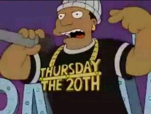 That's not even the joke. The episode was about Bart doing some higgy ***** raps at a concert and got in trouble or something. Homer (or who the **** ever I dont remember) wanted proof that he was there, so they found a recording of Bart rapping but couldn't prove that he was there at that time. So they fast forwarded and found a rapper that had one of those Flava Flav clock necklaces, but they still didn't have a date. Then they fast forwarded and found that dude who had a necklace that said Thursday the 20th. I wasted a bit too much time on this