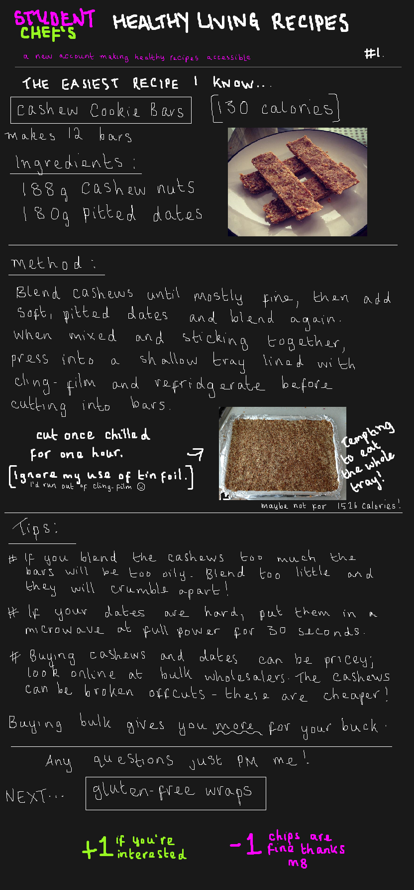 I'm a student that loves to cook and keeps an eye on calories. I eat mostly paleo (no grains, lots of natural fruits and meats) and wanted to share my recipes, so if you're interested in learning how to cook healthily, these might be beneficial