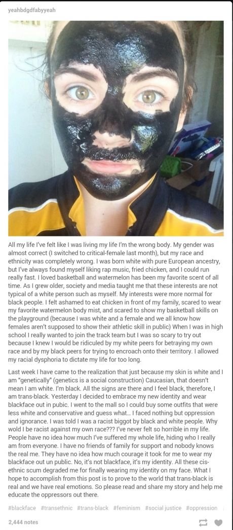 mean I am white. I' m black. All the signs are there and I feel black. therefore, I