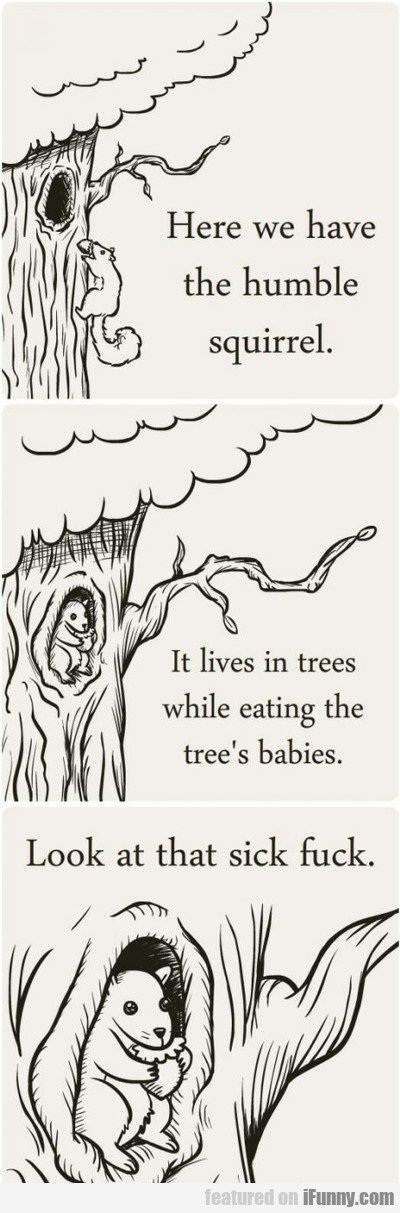 Here we have the humble squirrel. Flag tonesil (See more...) prev next random - Fav Favorite Comment ✖ PrevTop NextComment prev next Here we have the humble squirrel. n " It lives in trees l I l while eating the l I tree' s babies. ... +27 Views: 3229 Favorited: 2 Submitted: 01/10/2016 Share On Facebook -Favorite +Favorite Unsub from tonesil Subscribe to tonesil
