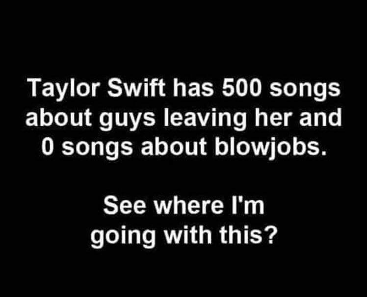 Left an amazing girl because she never gave head. Her favourite singer is taylor swift n Lady Gaga. I never told her the real reason I left her... We need female role models to tell girls to blow their man...
