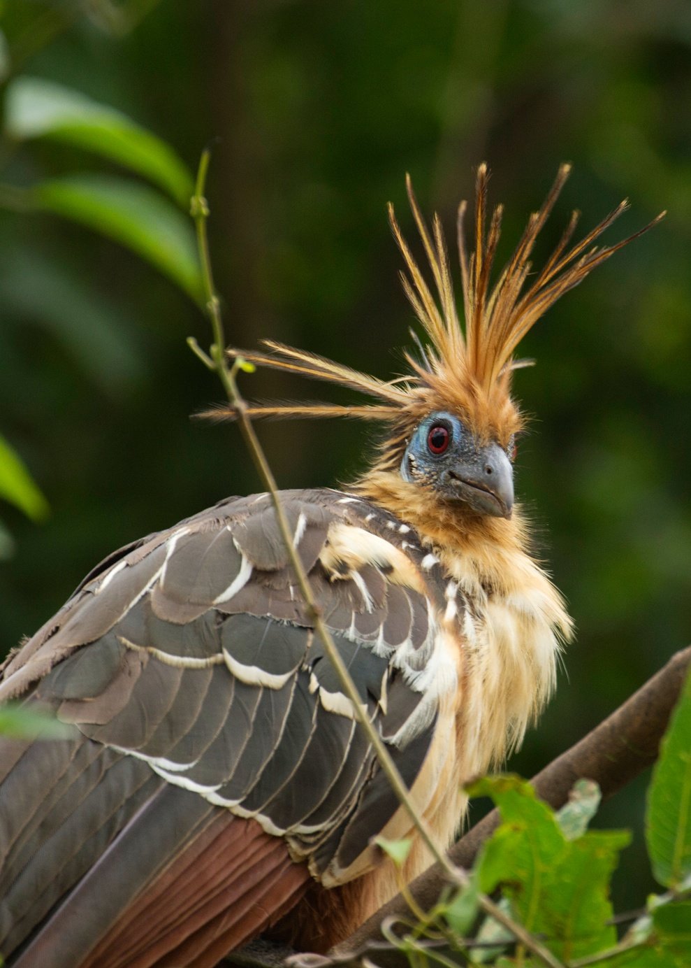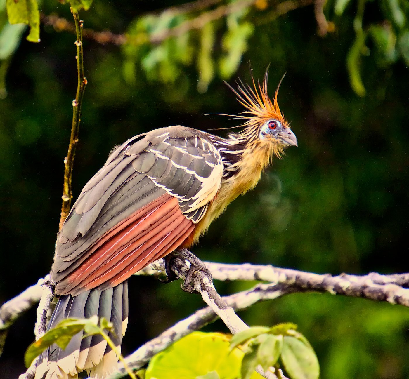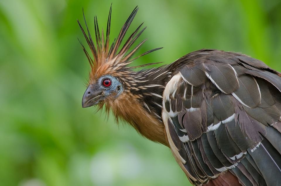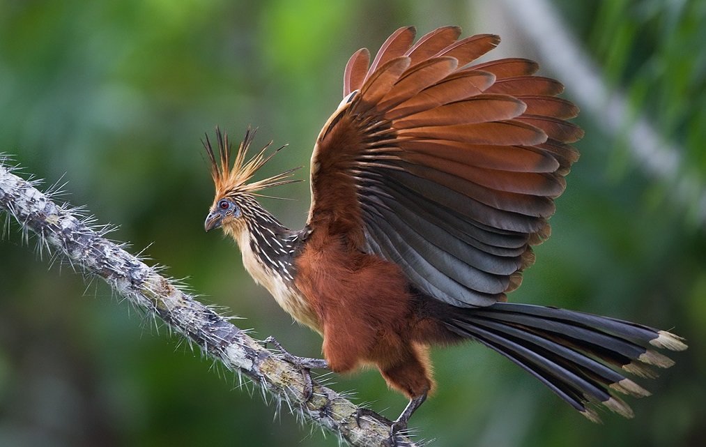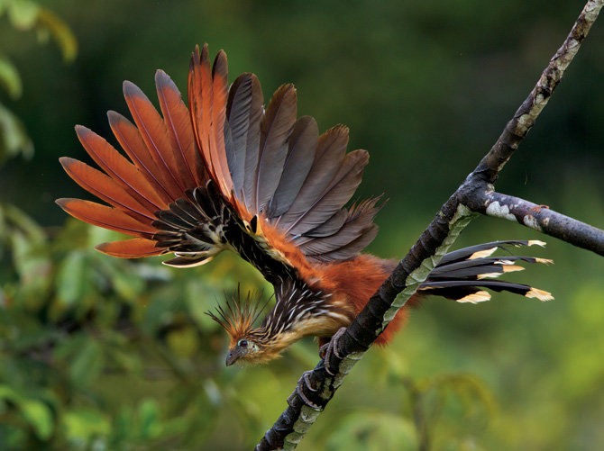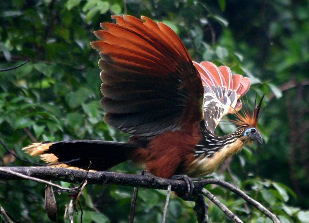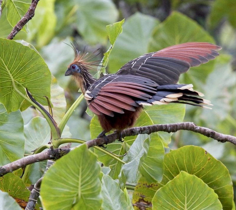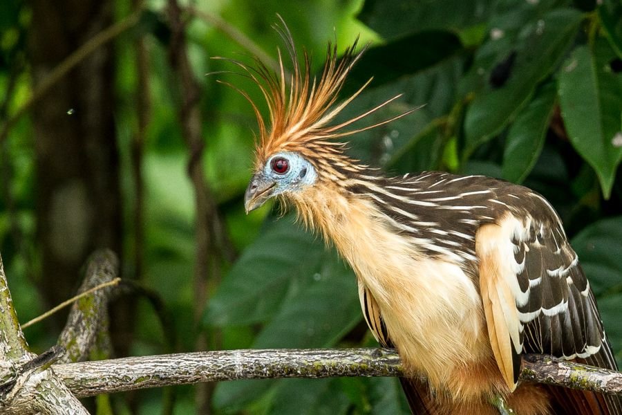 If threatened, the hoatzin bird often plunges into water to escape predators. An interesting fact is that they are the only bird to digest vegetation by fermentation, much like a cow. Although they can fly awkwardly over short distances, they spend much of their lives perched. When they need to move, they simply hop from branch to branch.