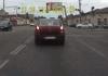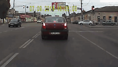 The small car got hit on the tail end, the force of the impact made it spin around and either his window was open and he got forced out by the centrifugal force of the spin, or the nose hit the back of the truck that hit him and also launched him out of one of the windows... At least that's what it looks like to me