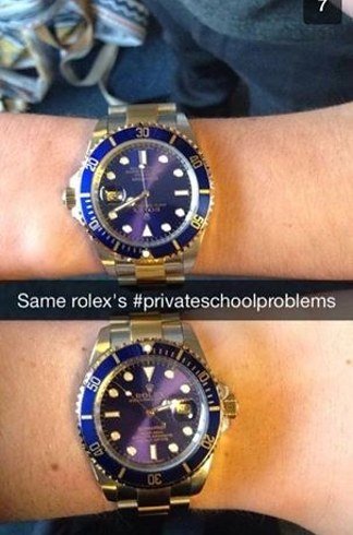 Ex- 1% here. This kind of thing makes me mad. I used to live in a third world country where society is still very retrograde, my family was one of the 1% there. We had maids and **** . And because you are raised that way you never really stop to think about how lucky you really are to be able to live a comfortable life. I'd sit and have breakfast with the maid every morning and she d tell me about how hard her life is. I started realizing that it was inhumane the difference between us two. How i dragged going to private school where i was getting the best education available while she worked her ass off to send her daughter to a public one in which her chances of graduating were about 51%. My family moved away, and my father's company went bankrupt. I had 6 different jobs that year, even selling pictures on the street, and as a maid for a rich family in Manhattan. And i truly understood what a prick i had been. Now things are fine, but we all agreed to pay for the daughter of the that girl that used to work for us to the college she got into (the best where i am from) and help them have a better, happier life instead of focusing on us. Do they really need 8 rolex? I dont think so. (pic sorta related)
