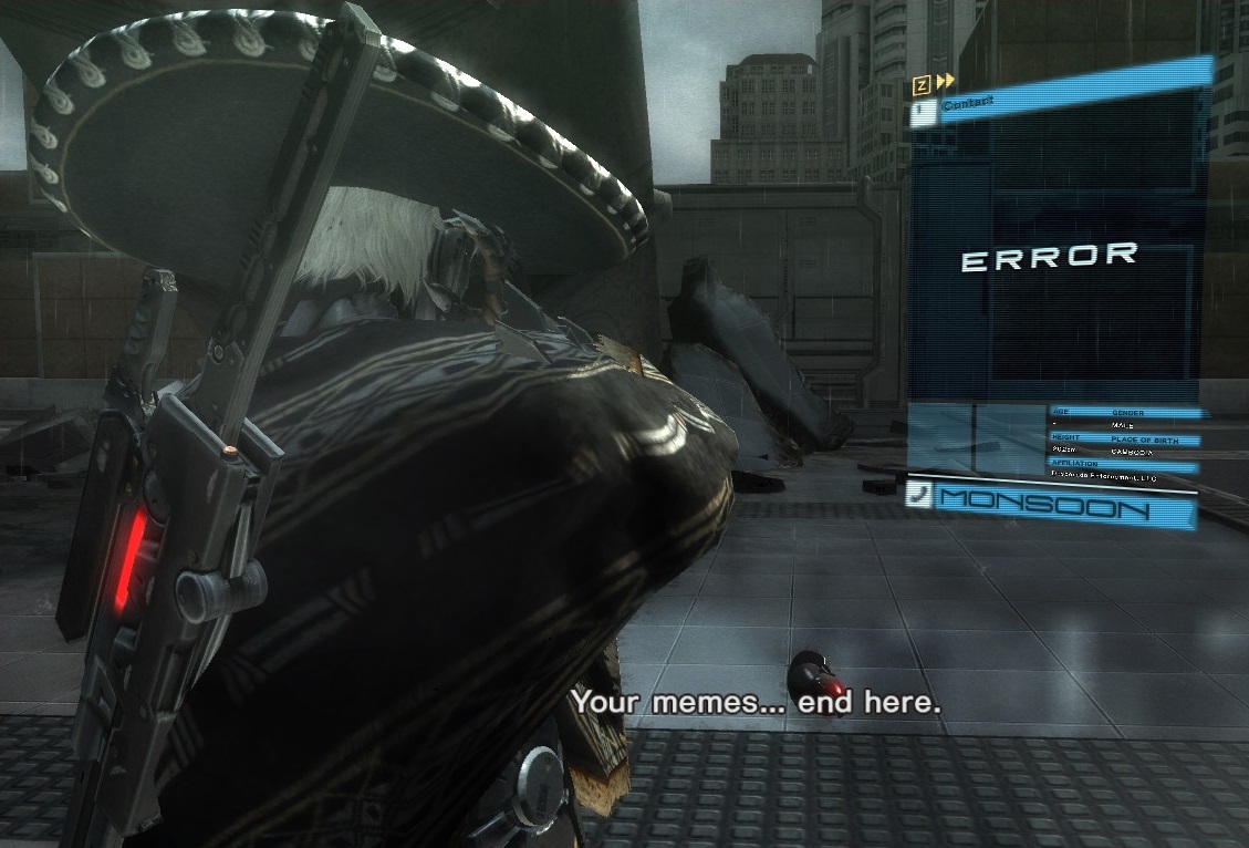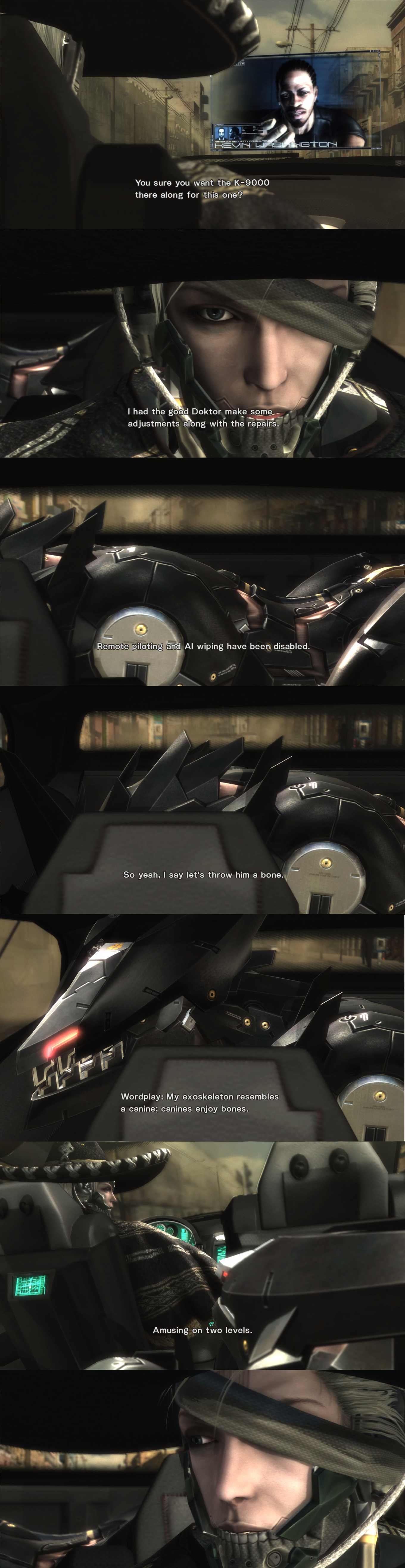 I love this scene from MGR:R, it's a ******* bad joke but i love it, so i decided to take screenshots in-game and paste it here, and see if you like it.
