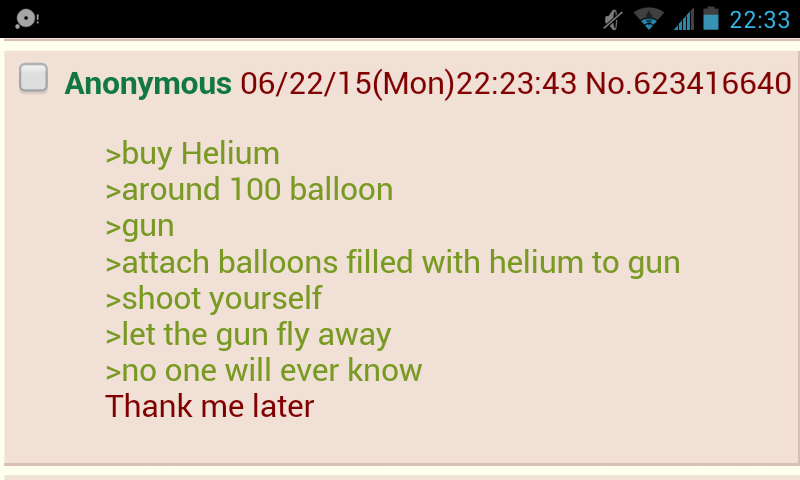 "Looks like the victim recently purchased a tank of helium, a bunch of balloons and a gun. They must have done that thing everyone on the internet says. That would also explain the gun attached to a deflated balloon that was in the papers 2 towns over."