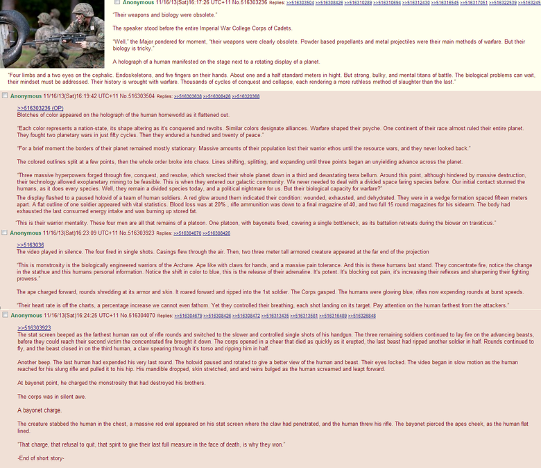 The ape charged forward, rounds shredding at its armer and skin. it reared forward and ripped into the Ist soldier. The Corps gasped. The humans were glowing blue, rifles new expending rounds at burst speeds.
