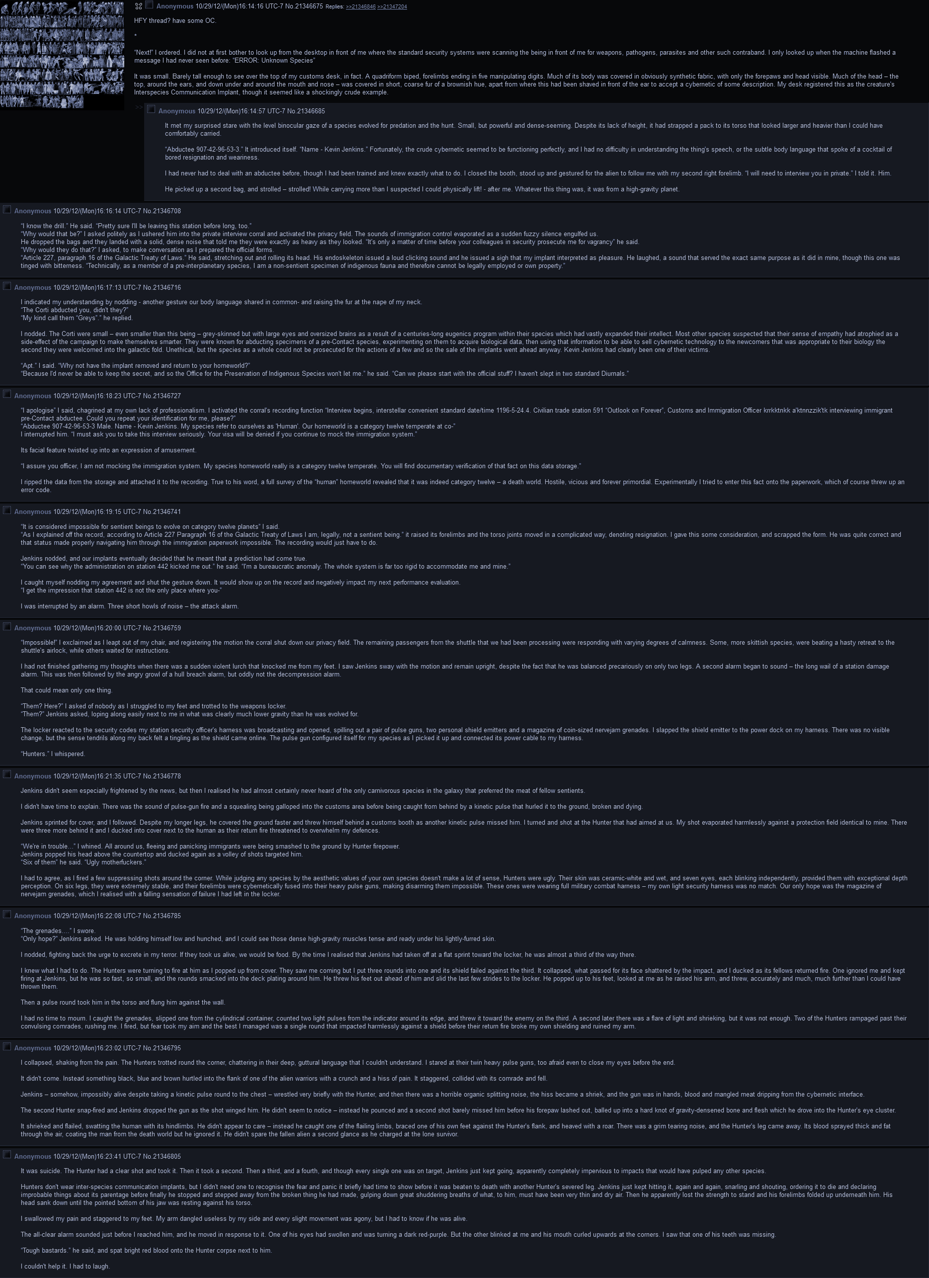 reached fer his slung rifle and pulled it to his hip. His mandible dropped, skin stretched, and and veins bulged as the human screamed and leapt forward.