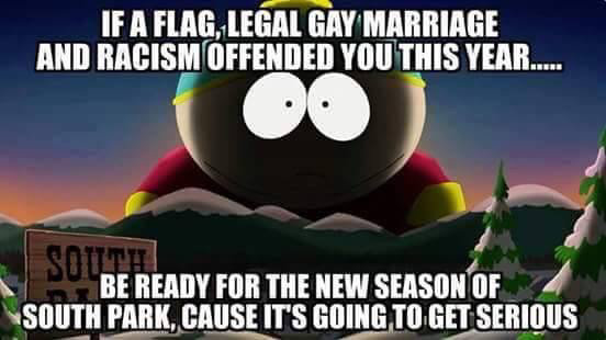 I've never been offended, I've never felt wronged over someone else's opinion, and so when i see people rage over south park, all I can do is laugh. I hope this season south park DESTROYS every meaning of the words "I'm offended"