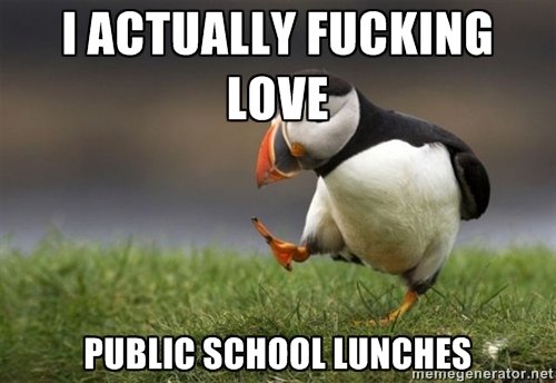 I love the chicken fajitas they make around here, and the tacos, and the hamburgers, and the pizza, and the tater tots. Too bad I'm not in school anymore, but when I sub taught I got to eat school lunches again. Omfg they were awesome.