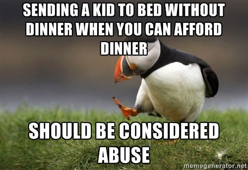 Personally I think denying a kid a meal when you can afford it is bad. Kids need to eat, just like you do. Making them go hungry just isn't healthy. Denying them dessert, yeah. Do that as much as you please. Dessert is not needed. But deny them part of a healthy diet? Nah. I just don't believe in it. Sorry.