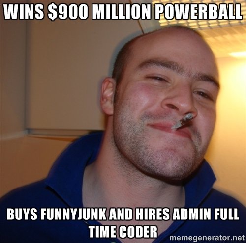 I will personally invest my money into buying out funnyjunk and hiring Admin to be my full time coder starting at a salary of $150,000 a year. With weekends off, paid holidays, and a lifetime free supply of Dragon Dildos. Admin will also be my tutor to teach me programming so we can rule funnyjunk forever, never having to ever worry about not making the server bills to keep this site running.