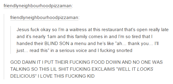 handed their BLIND SON a menu and he' s like "ah... thank gnu... I' ll