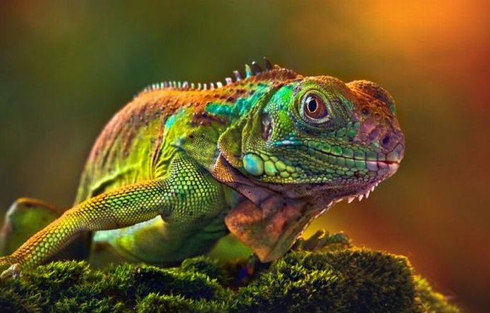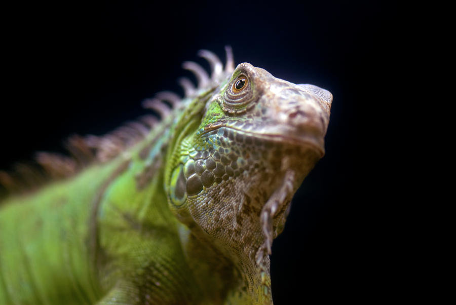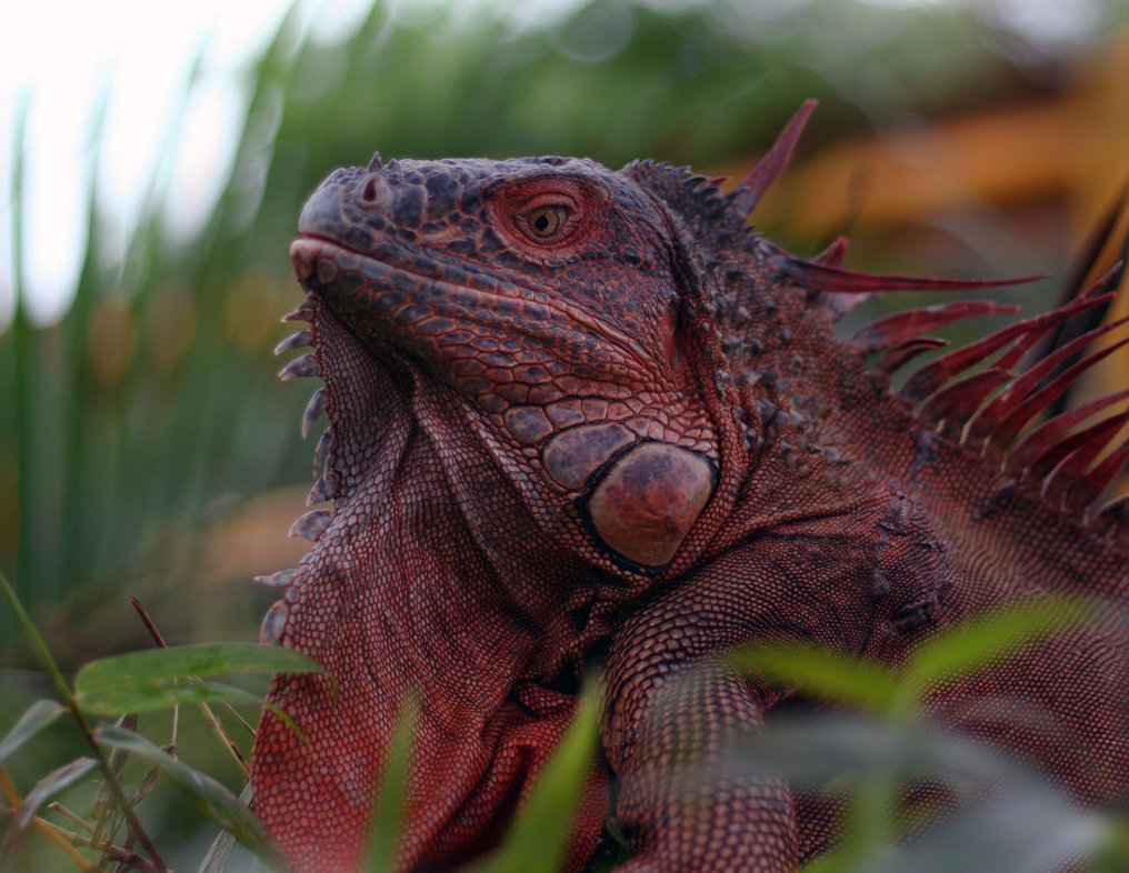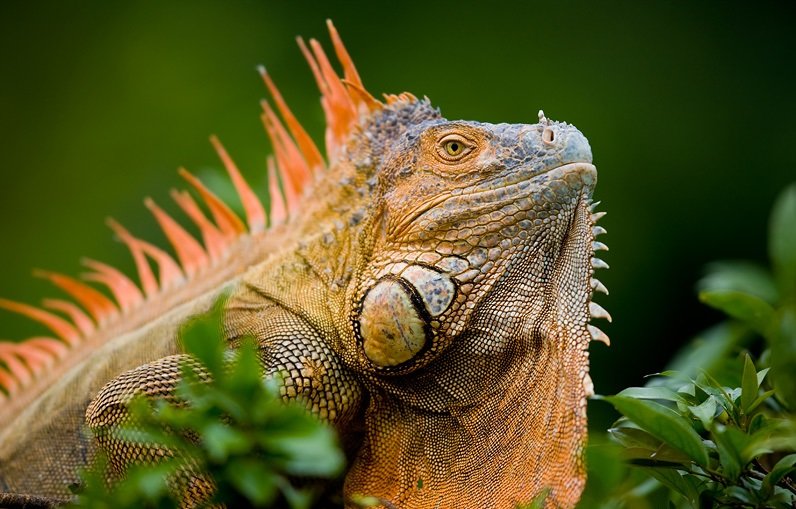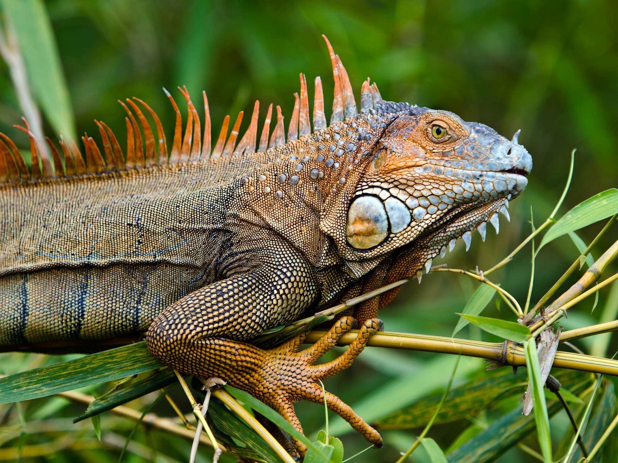 Primarily herbivorous, iguanas are active during the day, feeding on leaves, flowers, and fruit. They generally live near water and are excellent swimmers. If threatened, they will leap from a branch, often from great heights, and escape with a splash to the water below. They are also tough enough to land on solid ground from as high as 40 feet (12 meters) and survive.