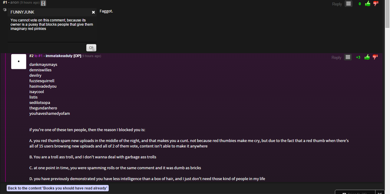 A, you red thumb spam new uploads In the middle of the night, and that makes you a cunt. not because red thumbies make me cry, but due to the fact thata red thumb when there' s