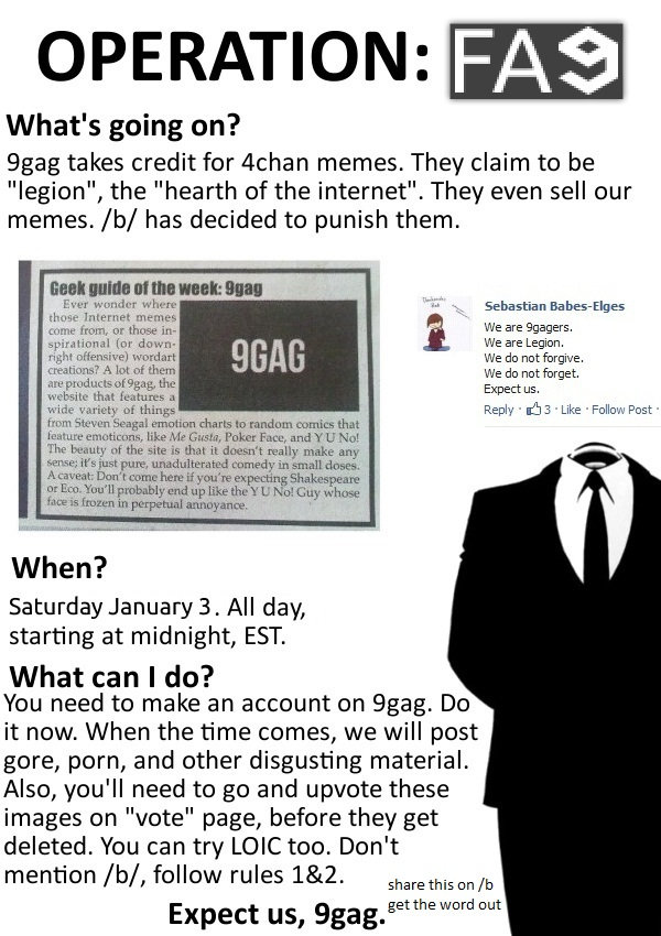 So basically tomorrow 2:00 EST 4chan wants to raid 9GAG. I thought since FJ is such a 4chan follower it might be best that we have a chance to take part.