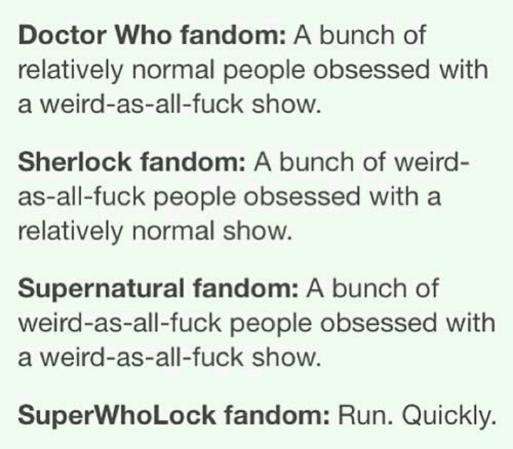Yes... supernatural is neither weird nor are its fans. Guy fans are i guess alright. Women fans are pretty much the same **** as with sherlock except they are bit edgy... saying **** like: when i die i'll go to hell and tell satan to get off my chair XDDDDDD