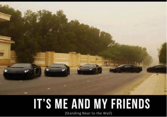 You're initially supposed to think that OP and his friends are in the row of supercars, but actually they're the group of people standing next to the wall in the background.