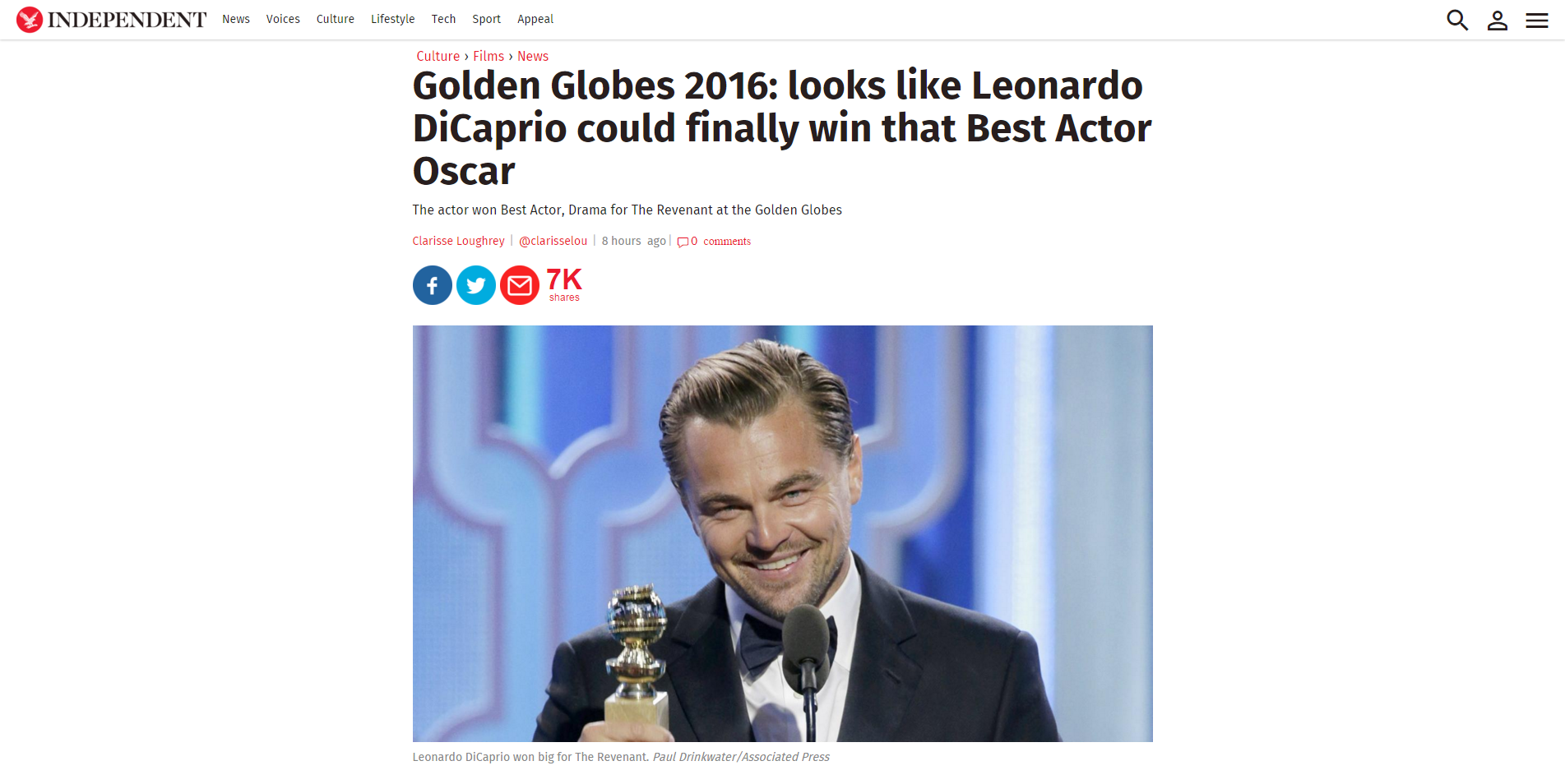 The actor won Best Actor, Drama for The Revenant at the Golden Globes