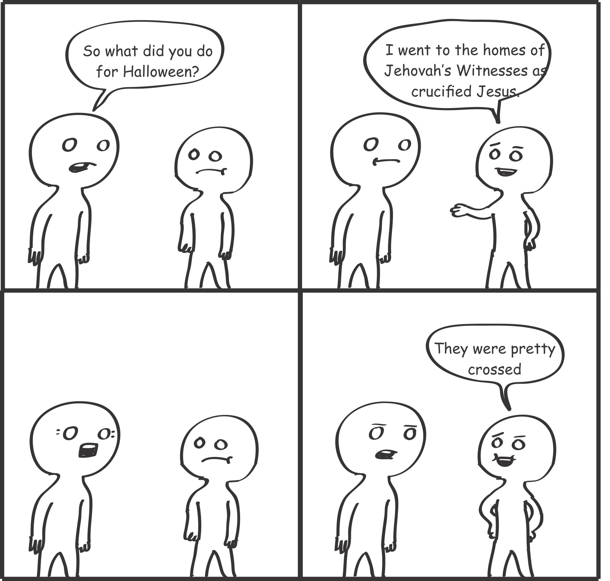 Jehovah's Witnesses need holiday spirit Flag kkkomics (See more...) next random - Fav Favorite Comment ✖ Top NextComment (Enlarge) First OC webcomic by Kataclysmic Konspiracy Komics. More to come next Tags: Halloween | OC | comics | comic | funny So what did you do I went to the homes of for Halloween? Jehovah' s Witnesses a crucified J es ... +106 Views: 8086 Favorited: 2 Submitted: 11/09/2015 Share On Facebook -Favorite +Favorite Unsub from kkkomics Subscribe to kkkomics
