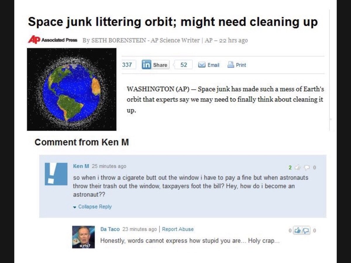 so when i throw a cigarete butt out the window i have to pay a fine but when astronauts