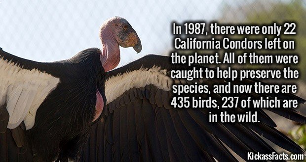What the fact about the condors neglects to mention is that the near extinction of the species was a bottleneck event which has lead to the newly established populations being severely lacking in genetic diversity. This means that not only is the species incredibly vulnerable to any threat, but most, if not all, of the resulting offspring suffer from some kind of congenital disease which, if I remember correctly, causes severe muscle atrophy. Bring back a species from the brink of extinction seems all well and good in theory, but if you don't have the genetic diversity to buffer it into stability, self sufficiency, and success, you might just be condemning generations of individuals to a lifetime of suffering for no reason.