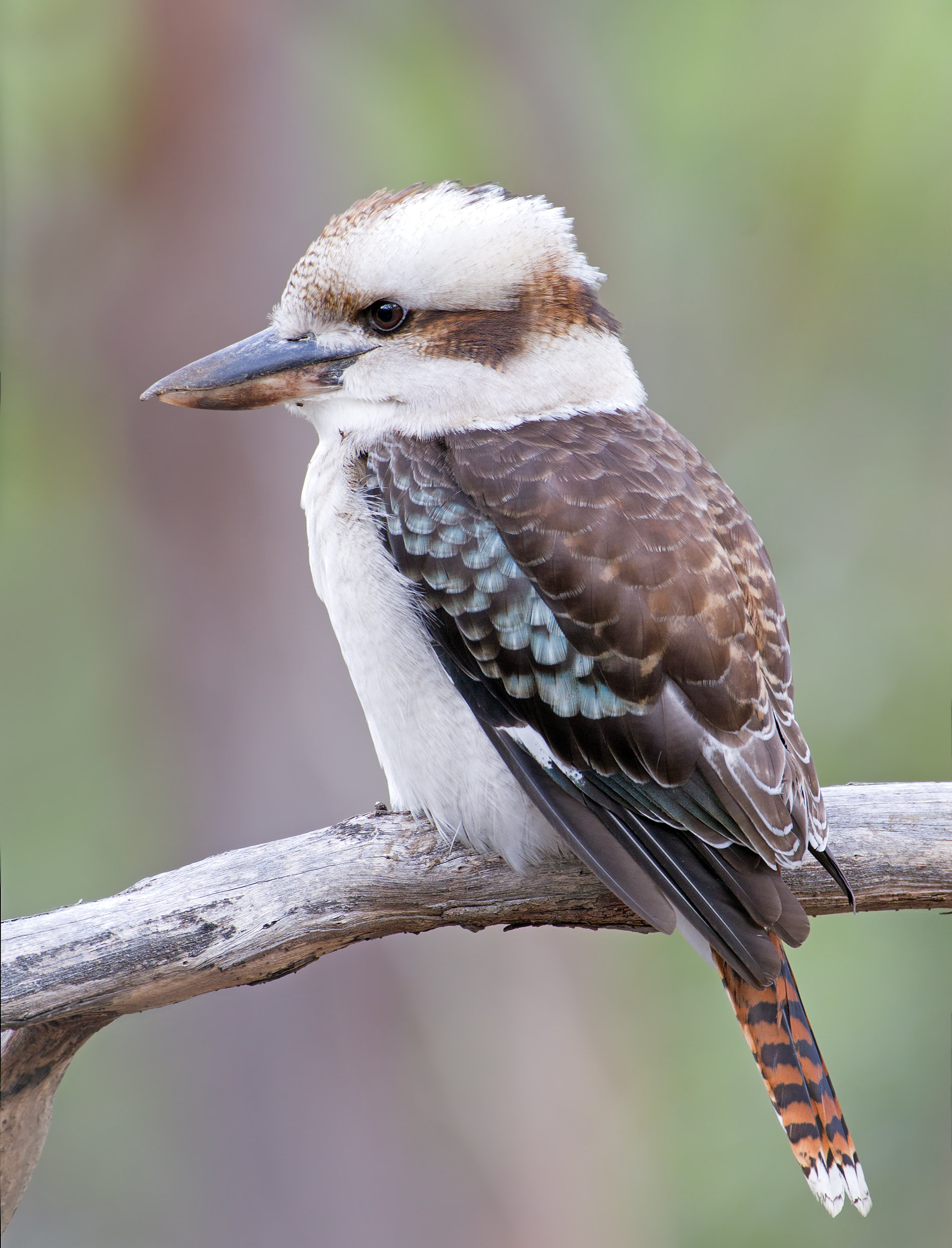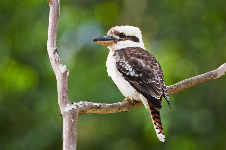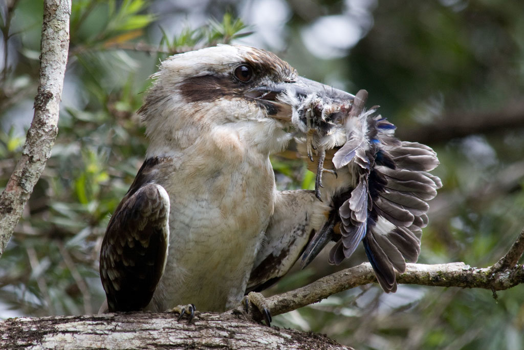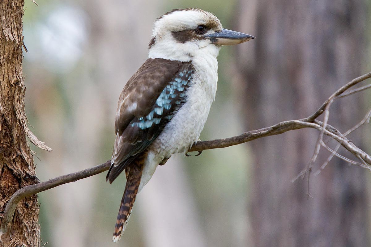 At twilight, kookaburras make loud, long calls that sound like laughter to let all know the boundaries of their territory. The largest of the kingfishers, kookaburras mate for life, living in pairs or small family groups. Chicks are born blind and naked, taking a month for their feathers to fill in. Older siblings often help their parents with the next clutch of eggs. The birds grow up to 47 cm (18.5 in) long and weigh about .5 kg (1 lb). Their bills are as long as 10 cm (4 in). Getting all their moisture from their food, they never need to drink water. They nest in hollow trees or termite mounds.
