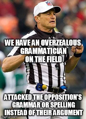 So many internet arguments dive straight into grammar bitching territory after only a few responses, and some try to diminish the other by calling them a kid or whatever and say they therefore cannot speak on the subject.