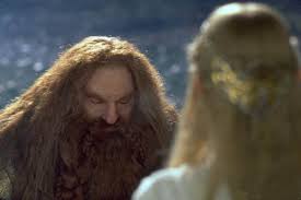 Galadriel orders Gimli to arsfor a gift (this can be seen