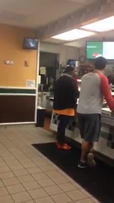 Holy *********** , why wouldn´t anyone actually intervene, like politely ask her to stop twice and then inform her that you will detain her until the police arrives if she continues, and whenever she began throwing stuff around or damaging the counter, you do it. ******* hell, how I hate people that abuse the people that serve them like that nogger in the vid.