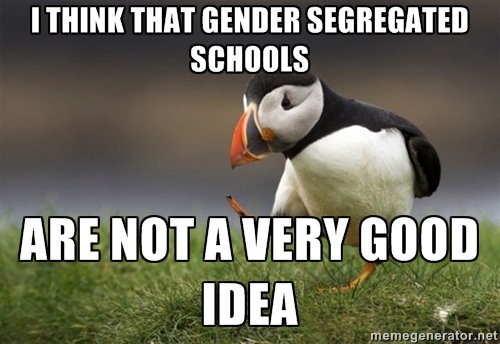 quick story about gender segregated schools. it was my sec 4 year (i live in queerbeck so yall figure that one out) i just entered what was once a all girl school. i was 6'2 at the time total studmuffin, practicly drowning in pussy buttttt i was chasing one girl and finally got the chance to **** her...... in the locker room after school, anyways were going at it and right before i finish BAM THE ******* PRINCIPLE WALKS IN AND SEES US of course she goes ******* . i didnt know this at the time but THE GIRL WAS THE PRINCIPLES DAUGHTER.....either way i get kicked out yada yada yada go to public school and continue on a spree of dumb **** . and i would continue but then it goes into how i met my fiance at public school and ****