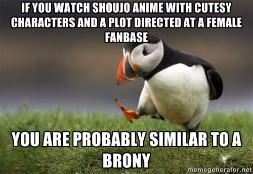 6) I never said that. I'm just saying that it's not fair for people who like other girly shows to get angry at bronies, because to me it's basically the same thing.