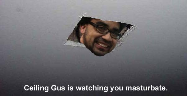 >some skinny dude with a backpack climbs out from UNDER the stall