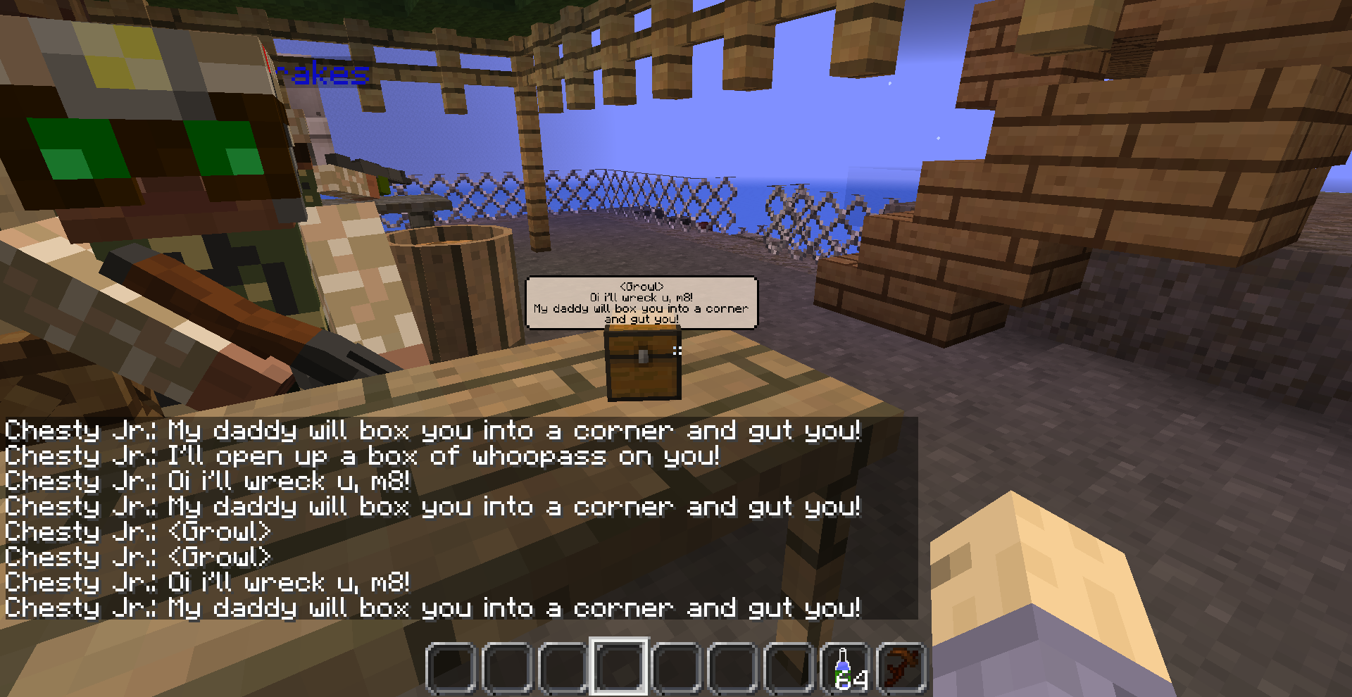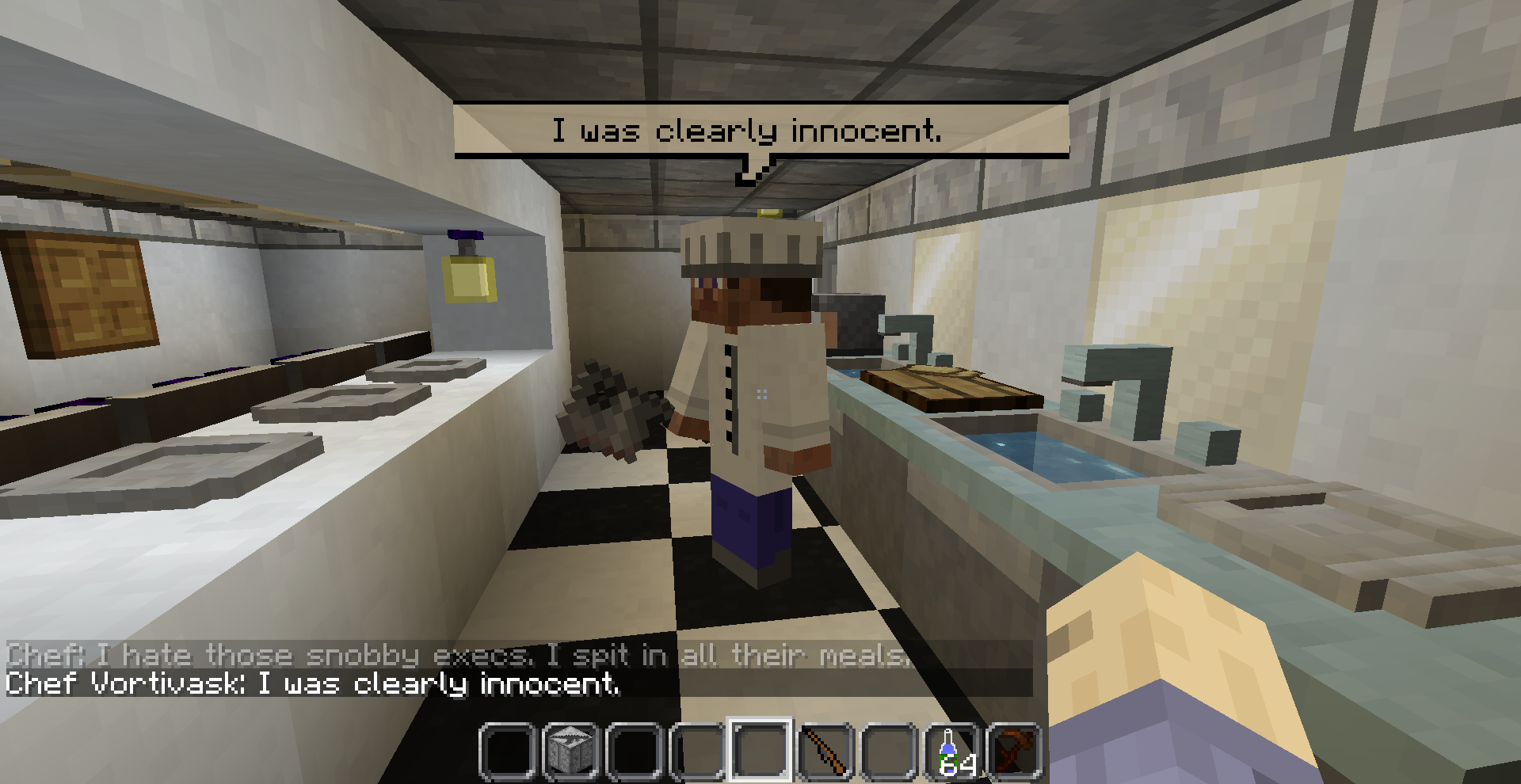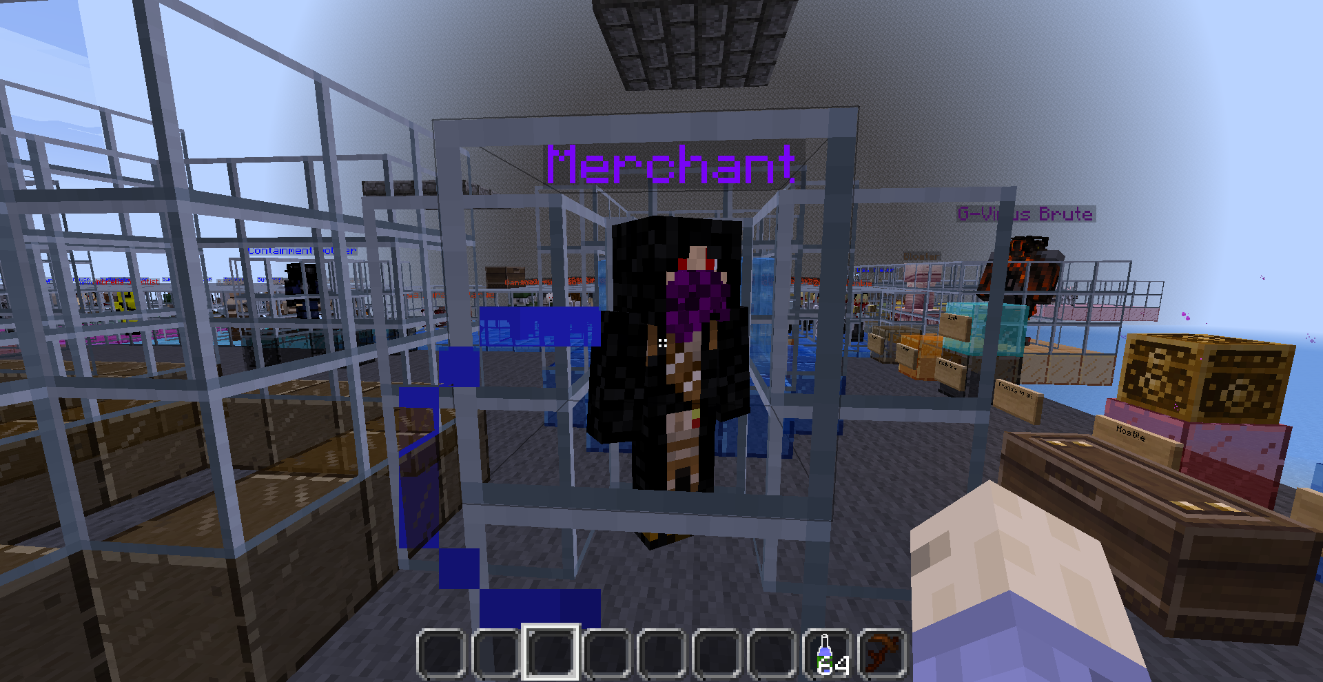 The map features a few mods. The biggest one is Custom NPCs. Custom NPCs lets you create custom NPCs(duh). You can edit these NPCs to great detail. You can change their skins(I've created a lot of custom skins for this. Over 20 zombie skins for variations), change their size/scaling, edit their health, edit their stats, make them fight, make boss fights, craete factions, make quests, create shop keepers, etc. Basically the mod gives you the ability to create a mini RPG provided you have the patience to go through with it. It even gives you a few decoratie blocks, new weapons/armor, and some Misc items that you can use when creating quests(quest items or even loot drops).