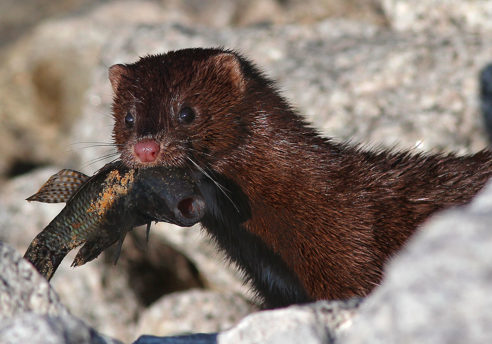 Mink is a mammal that belongs to the family of weasels. There are two species of mink, American and European that differ in size, color and type of habitat. American mink inhabits North America and Canada, while European mink inhabits Europe. Mink lives in areas near rivers, ponds, lakes, swamps and marshes, especially if they are rich in dense vegetation. Mink can be also found on numerous farms throughout the world. People raise minks because of their luxurious fur. Water pollution, habitat destruction and diseases are main factors that affect number of minks in the wild. Luckily, their population is still large and they are not on the list of endangered species.