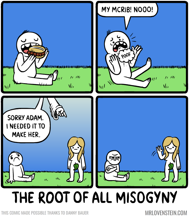 Misogyny Flag evilhomer (See more...) next random - Fav Favorite Comment ✖ Top NextComment next Tags: Misogyny | God | adam | eve | rib TE MCRIB! ! till H; I NEEDED IT TO MAKE HER- ... +97 Views: 6697 Favorited: 2 Submitted: 11/05/2015 Share On Facebook -Favorite +Favorite Unsub from evilhomer Subscribe to evilhomer