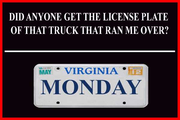 Monday Hit Me Like A Truck! Flag therifleman (See more...) next random - Fav Favorite Comment ✖ Top NextComment Monday always hits me like a runaway truck! You need to login to view this link next Tags: monday | funny +4 Views: 1144 Favorited: 0 Submitted: 12/12/2015 Share On Facebook -Favorite +Favorite Unsub from therifleman Subscribe to therifleman