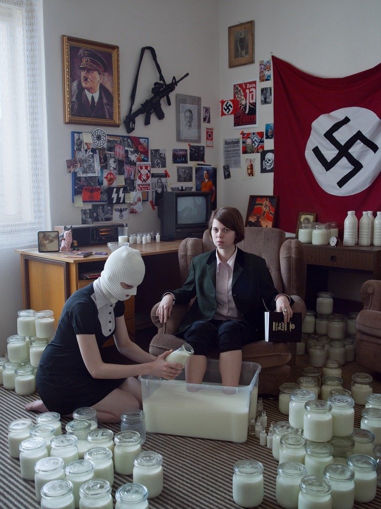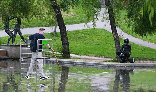 The Visitors, a french film were a middle aged knight and his filthy servant get sent forward in time accidentally. Right now they are smashing this car because it can move without any horses, but also because there's a black man in it.